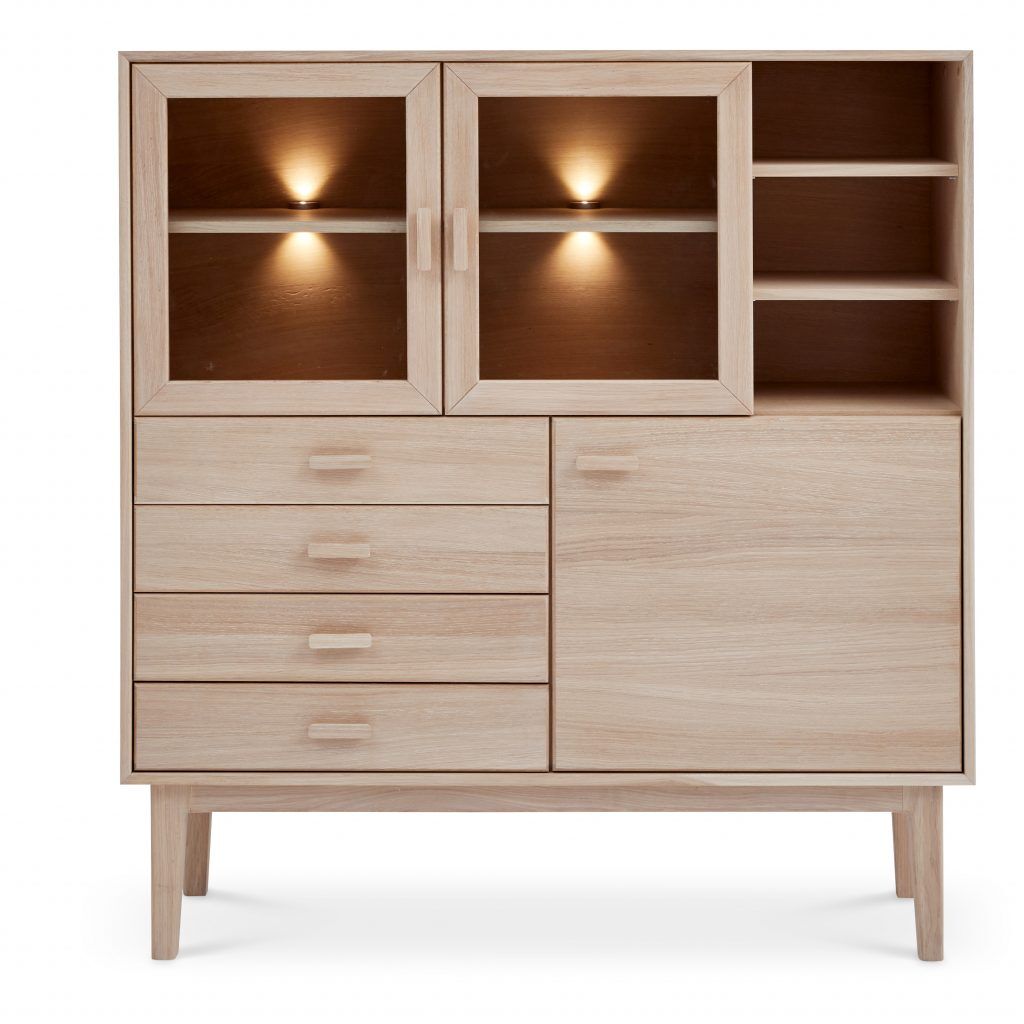 Highboard fra den populære Nord-serien. Nord highboard er som resten av serien, preget av sin klassiske, men stilige design er den perfekte kombinasjonen med både funksjonalitet og kvalitet. Nord highboard er laget i massiv eik. Den er behandlet med hvit olje for et lettere uttrykk. Nederst finner du fire skuffer og en tredør. På toppen kan du enten ha to glassdører eller to tredører. De ulike mulighetene gir helt ulike uttrykk.
